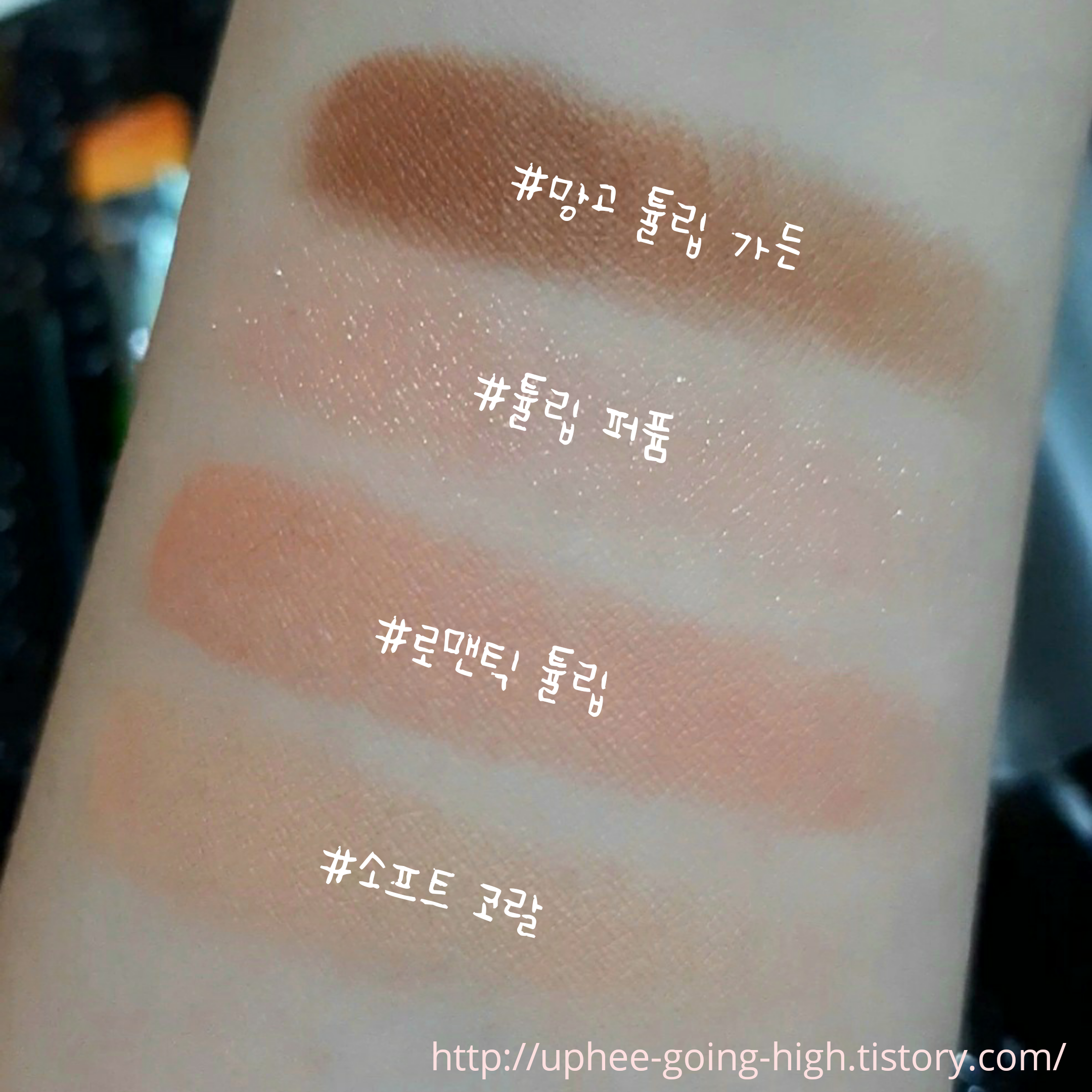 섀도우들의 컬러만 보면 흔하다고 생각될 수 있는 팔레트이나 가루가 정말 곱다는 것이 말린망고튤립만의 차별화된 점이라고 생각한다.